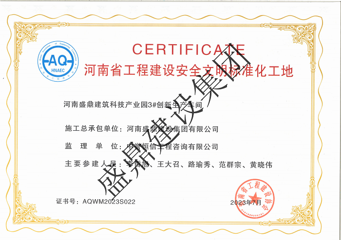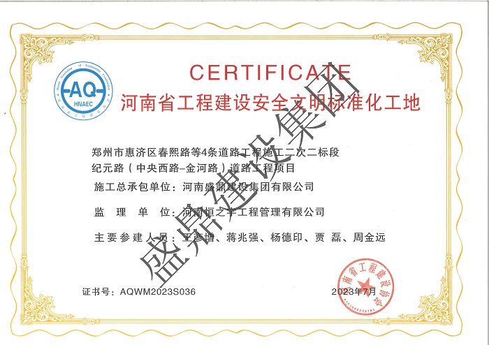 盛鼎建設(shè)集團承建的鄭州市惠濟區(qū)春熙路等4條道路工程項目、河南盛鼎建筑科技產(chǎn)業(yè)園獲評“河南省工程建設(shè)安全文明標準化工地”。